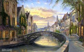 This painting uses many different factors to enhance its Romanticism. The first and most noticeable factor are the two couples on the walkway and inside the restaurant. The second and less noticeable factor is the sky. The time of day affects the sky by having the sun in just the right position, also the clouds enhance the light from the sun rays expressing that it is happy. It also adds a careful mixture of a city and nature, with flowers on walls and on the bridge. I think the artist used this because nature expresses Romanticism. Finally the painting is not all happy, the restaurant to the left of the painting is not as happy as the rest, it is partly destroyed showing that gloom is a part of Romantic paintings.